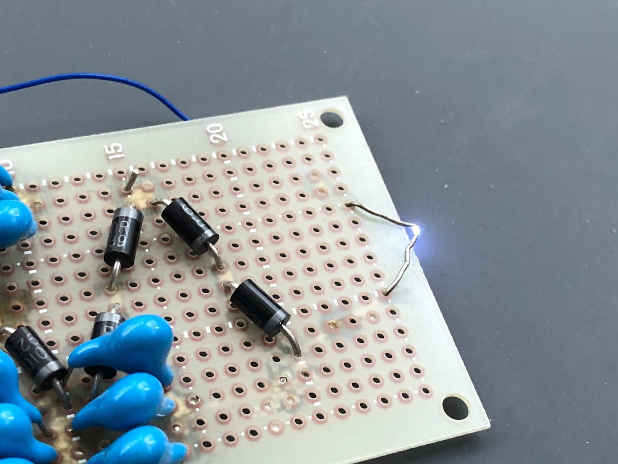 The back of the board looks like this. In the upper left corner, where the capacitor is soldered, a capacitor will be added.